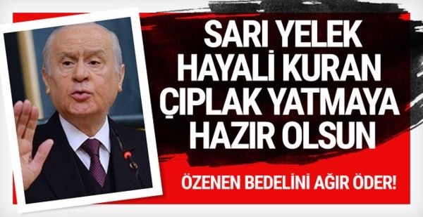 "Daha önce söyledim, bir kez daha söylüyorum, CHPHDPİP ve diğer mayası lekeli ortakları demokrasi dışı arayışlarla Cumhurbaşkanlığı Hükümet Sistemi’ni berhava etmeyi amaçlıyorlarsa, 12 Eylül öncesi şartları bu mankurtlara ikazla hatırlatmayı tarihi bir görev addederim. Fransa’yı baştan ayağa saran ve diğer Avrupa ülkelerine sıçrayan Sarı Yelek terörüne özenen varsa, bunun bedelini çok ağır ödeyeceklerini de şimdiden ifade etmek isterim. Sarı yelek giyen çıplak yatmayı göze almalıdır. Bu işin şakası yoktur. Mesele beka meselesidir. Mesele Türkiye meselesidir. Adalet Bakanlığı’nın önüne sandalye atıp oturmak için rest çekenler, YSK’yı kuşatmadan bahsedenler, zoru görünce kaçacak yer arayanlar vakit geç olmadan ayaklarını denk almalıdırlar. Milliyetçi Hareket Partisi 31 Mart 2019 Mahalli İdareler Seçimleri’ne üç belediye fazla alırım, beş belediye eksik alırım anlayışıyla yaklaşmıyor, yaklaşmayacaktır. 1 Nisan 2019 sabahı Türkiye’nin başına çorap örmek için hazırlık yapan, el ovuşturan, sarı rüyalar gören kim ya da kimler varsa karşılarında bizi bulacaklardır.