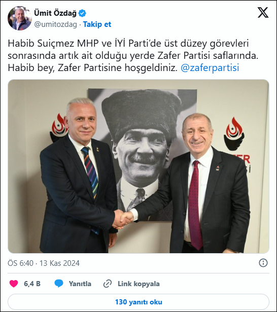 “Habib Suiçmez MHP ve İYİ Parti’de üst düzey görevleri sonrasında artık ait olduğu yerde Zafer Partisi saflarında. Habib bey, Zafer Partisine hoşgeldiniz.”