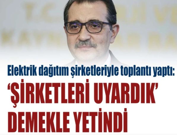 Enerji ve Tabii Kaynaklar Bakanı Fatih Dönmez, elektrik dağıtım şirketlerinin üst düzey yöneticileriyle bir araya geldi. Masada altyapı yatırımları, afet durumlarında şirketlerin planları ve yol haritaları vardı. Toplantının ardından Dönmez, şirketleri “uyardıkları” söyledi. Dönmez'in açıklamaları 21 özel dağıtım şirketinin insafına bırakılan, yükselen elektrik faturalarını ödeyemeyen ve kamulaştırma talebini dile getiren vatandaşların beklentisini karşılamadı.