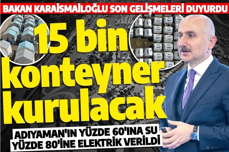 Adıyaman'da konteyner kent kurulumuna başladıklarını açıklayan Ulaştırma ve Altyapı Bakanı Adil Karaismailoğlu, önümüzdeki hafta vatandaşların konteynerlere yerleştirileceğini, hedeflerinin ise bir ayda 15 bin konteyner ev olduğunu duyurdu. Diğer yandan Karaismailoğlu, Adıyaman'ın yüzde 80'ine elektrik yüzde 60'ına ise su verdiklerini duyurdu.