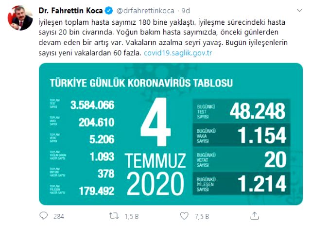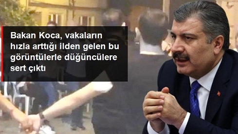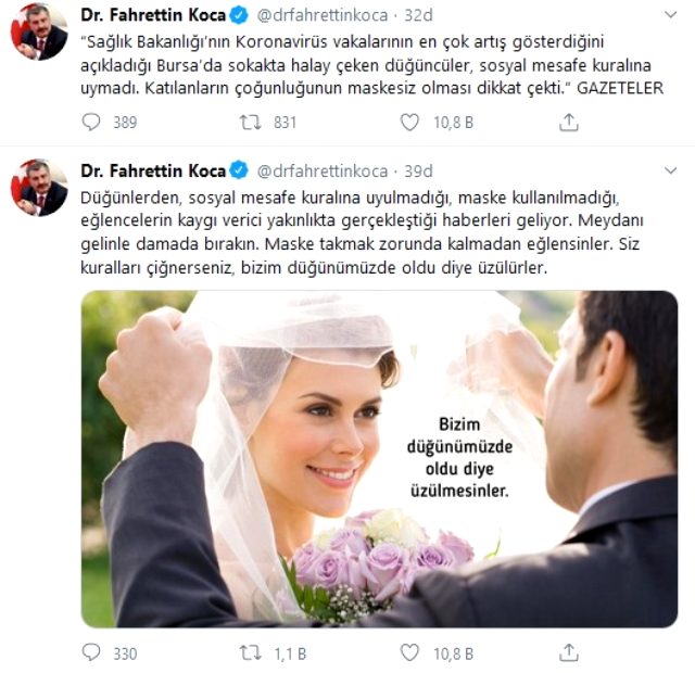 Sağlık Bakanı Fahrettin Koca, düğünlerde sosyal mesafe ve maske kuralına uyulması gerektiği uyarısında bulundu.Bakan Koca, Twitter hesabından yaptığı paylaşımda, Bursa'daki bir sokak düğününde sosyal mesafe kuralına uyulmadığı, maske kullanılmadığı, eğlencelerin kaygı verici yakınlıkta gerçekleştiği haberini paylaşarak bu görüntülere neden olanlara tepki gösterdi.
