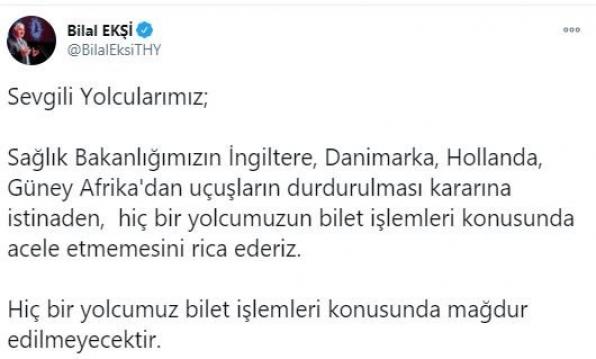 THY'DEN DURDURULAN UÇUŞLARLA İLGİLİ AÇIKLAMA İngiltere'de hızlı yayılan koronavirüsün bir türünün yüzde 70 daha hızlı yayıldığını ortaya çıkması ve uçuşların askıya alınmasının ardından Türk Hava Yolları'dan (THY)yapılan açıklamada, "Hiç bir yolcumuzun bilet işlemleri konusunda acele etmemesini rica ederiz" denildi. Konuyla ilgili olarak resmi Twitter adresinden bir açıklama yapan THY Genel Müdürü Bilal Ekşi,"Sağlık Bakanlığımızın İngiltere, Danimarka, Hollanda, Güney Afrika'dan uçuşların durdurulması kararına istinaden, hiç bir yolcumuzun bilet işlemleri konusunda acele etmemesini rica ederiz.Hiç bir yolcumuz bilet işlemleri konusunda mağdur edilmeyecektir"dedi.SHGM'DEN AVRUPA UÇUŞLARINA İLİŞKİN AÇIKLAMA İngiltere'de hızlı yayılan yeni tip koronavirüsün mutasyona uğraması ve bulaş hızının yüzde 70 daha fazla olması nedeniyle uçuşların askıya alındığı belirten Sivil Havacılık Genel Müdürlüğü (SHGM) uçuşu durdurulan ülkelere vatandaşların tahliyesinin karşılıklı yapılacağını duyurdu. Konuyla ilgili olarak SHGM'nin sosyal medya hesabı üzerinden yapılan açıklamada, Ülkemiz ile İngiltere, Hollanda, Danimarka ve Güney Afrika arasındaki uçuşlar ikinci bir değerlendirmeye kadar durdurulmuştur. Bu arada ilgili vatandaşların karşılıklı tahliyeleri kontrollü olarak yapılabilecektir. Saygıyla duyurulur" denildi.