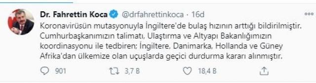 Sağlık Bakanı Fahrettin Koca, İngiltere, Danimarka, Hollanda ve Güney Afrika'dan Türkiye'ye uçuşlarda geçici durdurma kararının alındığını bildirdi. Bakan Koca, Twitter hesabından, "Koronavirüsün mutasyonuyla İngiltere'de bulaş hızının arttığı bildirilmiştir.Cumhurbaşkanımızın talimatı, Ulaştırma ve Altyapı Bakanlığımızın koordinasyonu ile tedbiren; İngiltere, Danimarka, Hollanda ve Güney Afrika'dan ülkemize olan uçuşlarda geçici durdurma kararı alınmıştır" bilgisini verdi. HIZLA YAYILIYOR! MUTASYONA UĞRAYAN VİRÜS 4 ÜLKEDE DAHA GÖRÜLDÜ Son dakika haberi... Dünya koronavirüsle mücadelede aşının bulunmasıyla umutlanırken, Birleşik Krallık'tan gelen 'mutasyon' haberi dünya medyasının gündemine oturmuş durumda. Avrupa ülkeleri Britanya ile uçuşları askıya alırken, en az dört ülkede daha mutasyona uğrayan koronavirüs vakası tespit edildi. Birleşik Krallık'tan gelen koronavirüs tablosu ise durumun vahametini ortaya koydu.>>>>