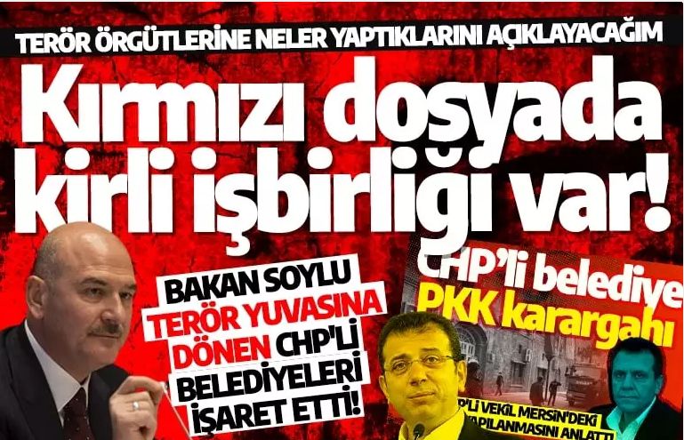 İçişleri Bakanı Süleyman Soylu, Bakanlığın TBMM'de süren bütçe görüşmeleri sırasında, "Terör Soruşturmaları (Belediyeler)" yazılı kırmızı bir defter alıp CHP’li belediyelerin terörle yaptıkları kirli iş birliğini açıklayacağını duyurdu. Bakan Soylu, "Mersin Belediyesi, İstanbul Büyükşehir Belediyesi, Adana Seyhan Belediyesi, İstanbul Ataşehir Belediyesi'nin, terör örgütlerine neler yaptıklarını haftaya basın toplantısıyla açıklayacağım." dedi. Bakan Soylu, muhalefet partilerinin vekillerine dönerek, "Hem anlaşma yapacaksın HDP ve PKK ile hem terör örgütlerinin üyelerini oraya koyacaksın hem de diyeceksin ki: Bunun suçlusu İçişleri Bakanlığıdır. Yok öyle" dedi.