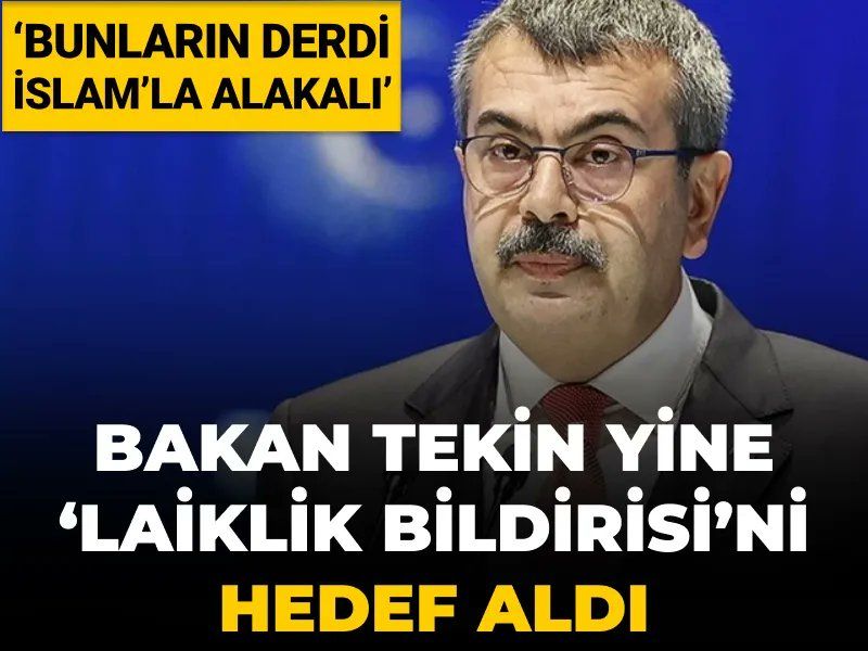 Bakan Tekin, A Haber'de katıldığı programda gündeme dair değerlendirmeler yaptı. Bakanlık uygulamalarına yönelik "laiklik zedeleniyor" gerekçesiyle açılan davaları eleştiren Tekin, aralarında gazeteci, yazar, sanatçı ve akademisyenlerin bulunduğu 168 kişinin imzaladığı 'Laiklik Bildirisi’ni de bir kez daha hedef aldı.