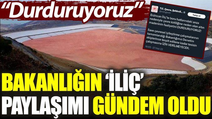 27 Haziran 2022'de, bakanlığın resmi sosyal medya hesabından yapılan paylaşımda, "Erzincan İliç’te boru hatlarındaki arıza nedeniyle çevre kirliliğine neden olan altın madeninin faaliyetini DURDURUYORUZ!