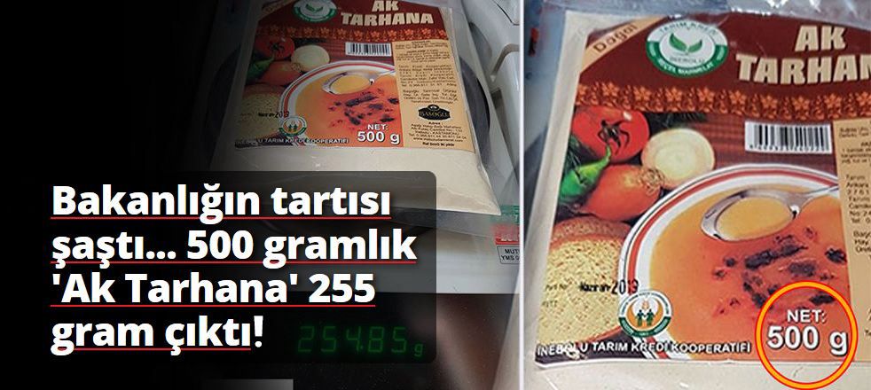 500 gramlık tarhana, 255 gram geldi. Tarhanayı alan bir vatandaş, “Bu yarım kilo olamaz” diyerek tarttırdı, paketin üzerinde 500 gram yazmasına rağmen, tarhananın 255 gram olduğunu gördü.