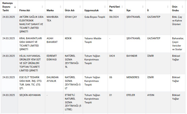 Tarım ve Orman Bakanlığı tarafınca meydana getirilen kontrollerde, dana-kuzu ızgara köftede kanatlı eti, iki farklı markanın sızma zeytinyağında ise tohum yağı tespit edilmesi üzerine bu ürünler, ‘öykünmek veya Tağşiş meydana getirilen Gıdalar’ listesine dahil edildi.