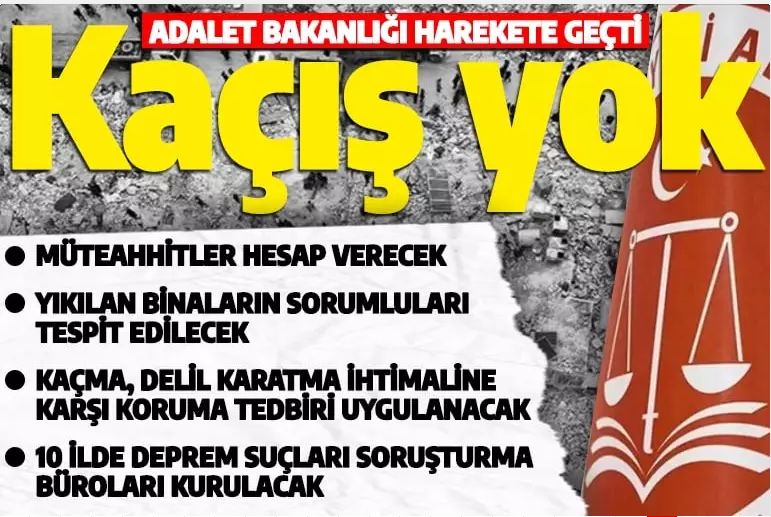 Adalet Bakanlığı, depremden etkilenen illerde yıkılan binalarla ilgili Deprem Suçları Soruşturma Büroları kurulmasını istedi. Duyuruda, soruşturmaların selameti bakımından binalarla ilgili delil toplama işlemlerinin ve şüphelilerle ilgili koruma tedbirlerinin süratle yerine getirilmesini vurgulandı. Bakanlık, yıkılan binalardan kaynaklı ölümler ve yaralanmalar kapsamında Cumhuriyet Başsavcılıklarınca yürütülecek soruşturmalarda etkinliğin sağlanması amacıyla duyuru yayınladı.
