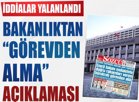 Enerji ve Tabii Kaynaklar Bakanlığı, Sözcü Gazetesi'nin manşetinde yer alan 'Enerji Bakanı Muhalefete Doğru Rakamları Veren Bürokratı Görevden Aldı' başlıklI haberi yalanladı.