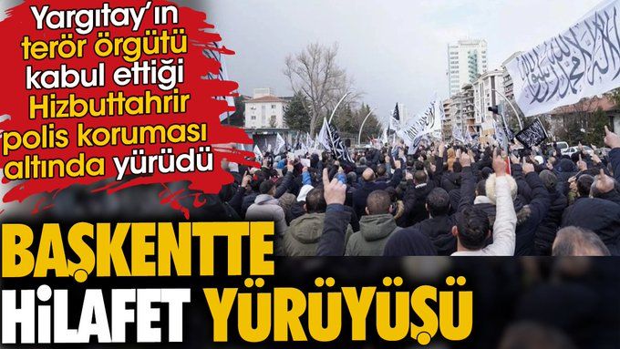 Türkiye’nin başkentinde hilafet yürüyüşü düzenlendi. Terör örgütü olarak kabul edilen Hizbuttahrir’in yürüyüşü polis koruması eşliğinde yapılırken sloganlar ile hilafet çağrısı yapıldı.