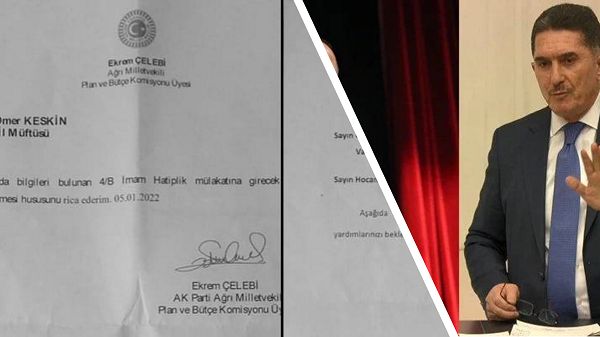 AKP milletvekilleri Van Müftüsü’ne yazı göndererek yakınları için torpil ricasında bulundu. AKP Ağrı Milletvekili Ekrem Çelebi Van İl Müftülüsü Ömer Keskin’e, TBMM amblemi ve imzası bulunan 5 Ocak 2022 tarihli yazısında “Aşağıda bilgileri bulunan 4/B İmam Hatiplik mülakatına girecek ilgililerin değerlendirilmesi hususunu rica ederim” ifadesi yer aldı.