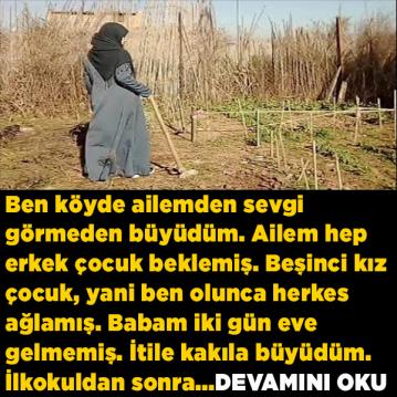 Bir hafta sonra eşimin köyüne döndük. Bizim köye hiç benzemiyordu. Meğer bu köyde başlık parası varmış. Başta istemesede bu durum hoşuna gitti, bedava bir gelin sahibi oldu. Kaynanam beni kabullendi. Kaynanamla yaşamaya başladım.Babam beni evlatlıktan reddetti. Kaynanam yıllarca uğraştı, barıştırmak elini öptürmek istesede asla kabul etmedi. Annem ve kızkardeşlerimle görüşürüm ama asla baba evine giremem.Kızım dedi kaynanam, «artık bundan sonra sen benim kızımsın, bende senin annen bunu böyle bil.» Sert otoriter bir yapıya sahipti. Evde kuralları o koyuyor herkes uymak zorunda kalıyordu. Eşim annesinin lafından asla çıkmıyordu. Genelde yazın eşim çalışmaya gidiyor ben aylarca Kaynanamla yalnız kalıyordum. Giderken anamın lafından çıkma diye sıkı sıkı tembih ediyordu bu beni deli ediyordu.Ben aslında her işi bildiğimi sanıyordum ama evlenince hiç bir şey bilmediğimi fark ettim. Babam hiç evde durmaz dışardan yer içer. Bizde öyle öğün falan yok acıkan ekmeğin arasına çökelek, peynir, reçel ne bulursa yerdi. Gece geç saatlere kadar ablalarımla radyoyu açar halı dokur sonra öğlene kadar yatardık. Annem pek evde durmaz o komşu senin bu komşu benim gezerdi. Evin işini üstünkörü ablalarım yarım saatte bitirir tekrar halıya otururduk. Ben hiç ev işi yapmazdım..............HABERİN DEVAMI İÇİN FOTOĞRAFA TIKLAYIN