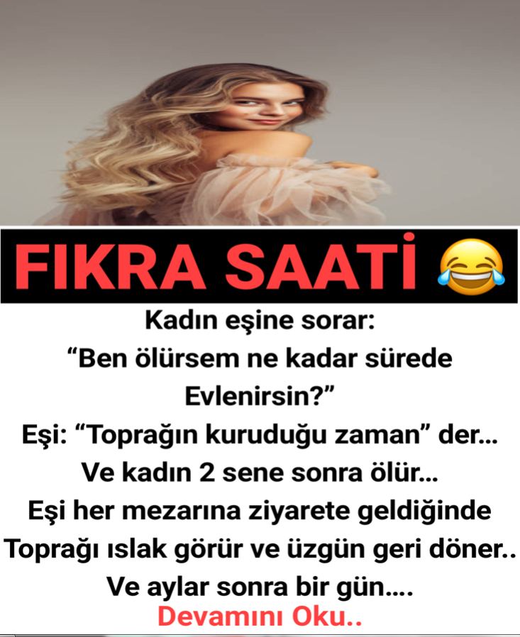 Kadın eşine sorar: “Ben ölürsem ne kadar sürede evlenirsin?” Eşi: “Toprağın kuruduğu zaman” der… Ve kadın 2 sene sonra ölür… Eşi her mezarına ziyarete geldiğinde toprağı ıslak görür ve üzgün geri döner.. Ve aylar sonra bir gün mezarlığa giderken kayınçosunu görür ne yaptığını sorar…