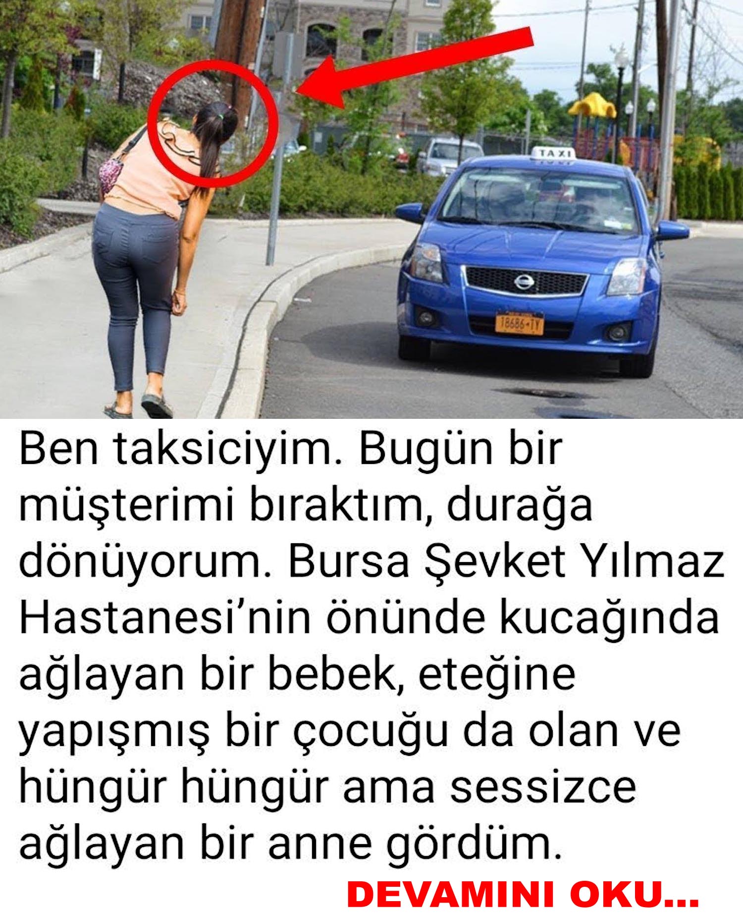 en taksiciyim. Bugün bir müşterimi bıraktım, durağa dönüyorum. Bursa Şevket Yılmaz Hastanesi’nin önünde kucağında ağlayan bir bebek, eteğine yapışmış bir çocuğu da olan ve hüngür hüngür ama sessizce ağlayan bir anne gördüm. Durdum. ‘’Abla yanlış anlamazsan buyur bırakayım’’ dedim. Bak bebek de ağlıyor, sende. Param yok ki abi dedi. Olsun, bu da benim sadakam, hayrım olsun. Neyse bindi.