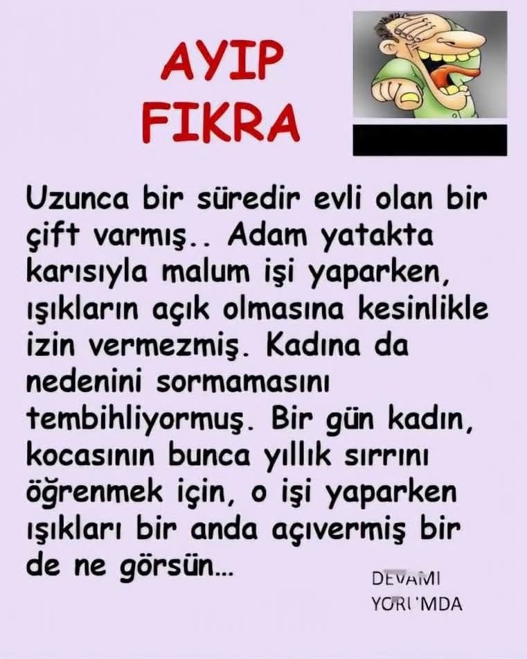 18 yaşında genç bir delikanlı babasına sorar: Baba ben gerdeğe girdiğimde ne yapıcam? Baba: Oğlum sen hele bir büyü de o zaman söylerim. Yıllar geçer çocuk evlenmeye karar verir. Evlendiği gece babasına sorar: Baba yıllar önce sormuştum gerdekte ne yapıcam diye. Baba cevap verir: Oğlum karın ne yaparsa sen de onu yap. Çocuk gerdeğe girer. Karısı kıyafetini çıkarır. O da çıkarır. Kadın yatağa uzanır. Çocukta yatağa uzanır. Kadın bacaklarını…