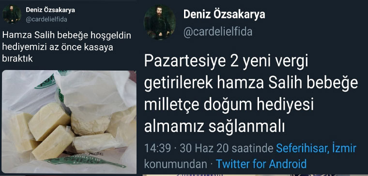 "Pazartesi iki yeni vergi getirilerek Hamza Salih bebeğe milletçe doğum günü hediyesi almamız sağlanmalı."