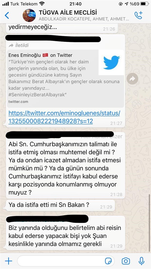 ‘TÜGVA Aile Meclisi’ grubunda geçen konuşmalarda istifaya ilişkin TÜGVA üyesi bir kişinin, “Değerli arkadaşlar; #SeninleyizBeratAlbayrak tag ile güçlü bir destek veriyoruz. Milli duruşu, milli mücadeleyi yedirmeyeceğiz…” diye yazdığı, daha sonrasında bir grupta bir tweet paylaştığı görüldü.