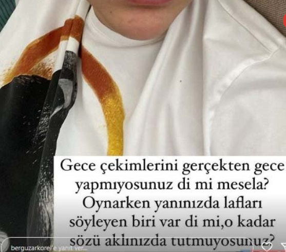 Bergüzar Korel, bacaklarındaki morlukları ve yorgun halini gösteren gönderilerinin altına şu açıklamayı not düştü: “Siz oyuncuların çok eğlenceli bir hayatı var yaaa… Mesela o morluklar tokatlar filan hep rol değil mi? Oynarken yanınızda lafları söyleyen biri var değil mi, o kadar sözü aklınızda tutmuyorsunuz.”