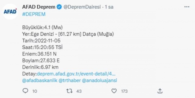 Bölgede bugün de sarsıntılar yaşandı. Ege Denizi'nde saat 15.20'de 4,1 büyüklüğünde deprem meydana geldi. AFAD, depremin Muğla'nın Datça ilçesine 61,27 kilometre uzaklıkta yaşandığını belirtti. İlk belirlemelere göre herhangi bir can veya mal kaybı yaşanmadı.