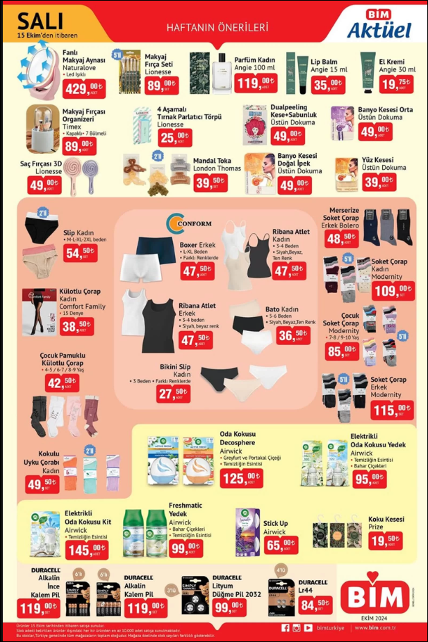 BİM’de bu hafta 15 Ekim ile 22 Ekim 2024 tarihleri arasında geçerli olacak haftanın önerileri kataloğu yayınlandı. BİM 15 Ekim 2024 Salı kataloğu ile bu hafta gelecek aktüel ürünler belli oldu. 15 Ekim Salı günü BİM’de hangi ürünler yer alacak hemen bakalım…Detayı diğer sayfamıza geçerek okuyunuz