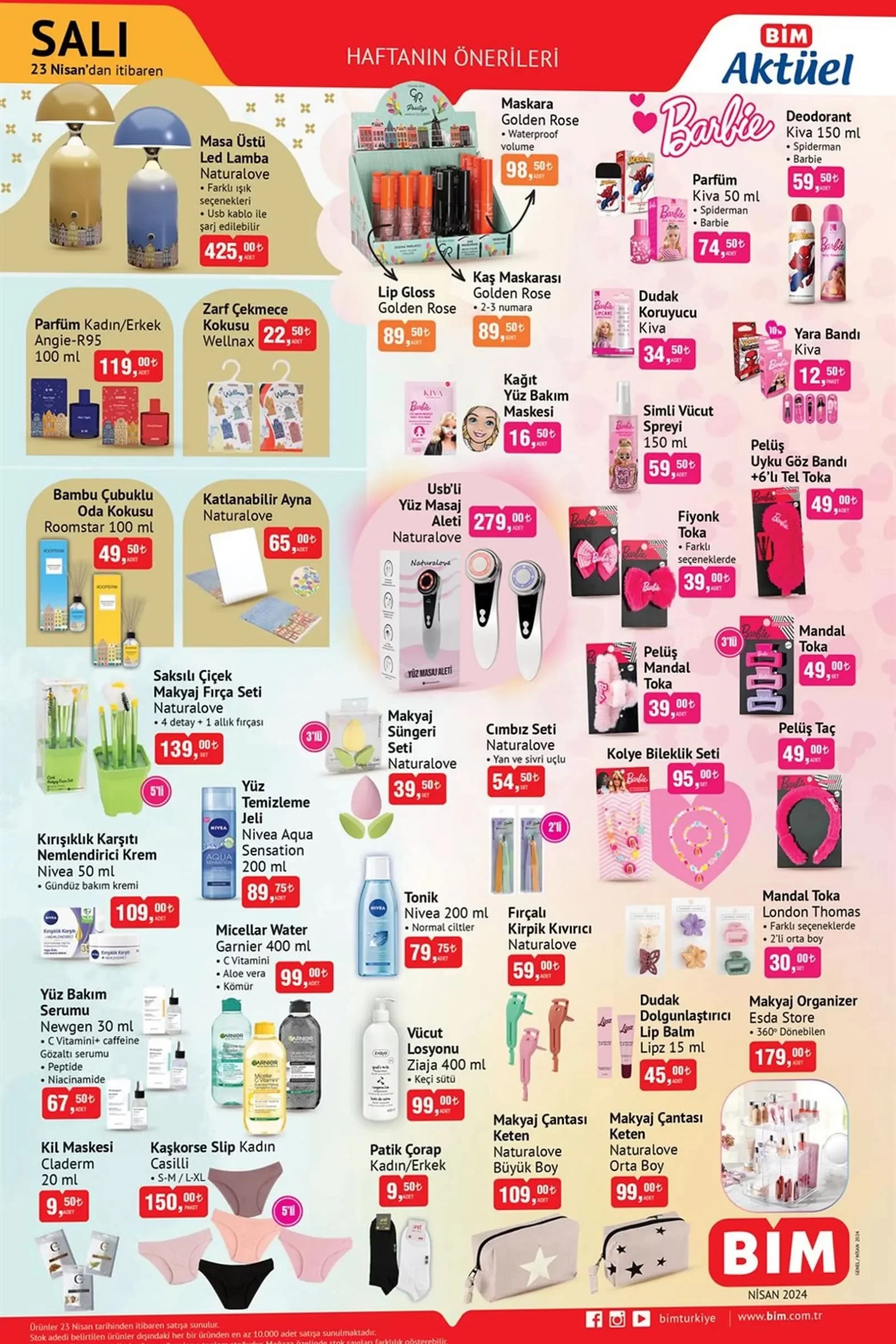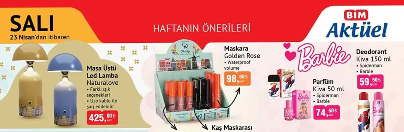 Market kampanyasında Naturalove Masa Üstü Led Lamba, Angie-R95 Parfüm, Aquabor Toz Deterjan ve Naturalove Keten Büyük Boy Makyaj Çantası gibi ürünlerde avantajlı fiyatları görüyoruz. BİM 23 Nisan 2024 Aktüel Ürünler Kataloğu ile bu hafta gelecek tüm ürünlere sayfanın devamından ulaşabilirsiniz.