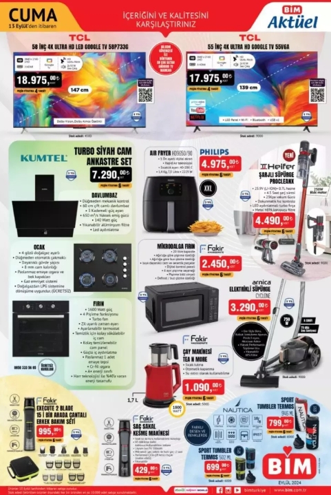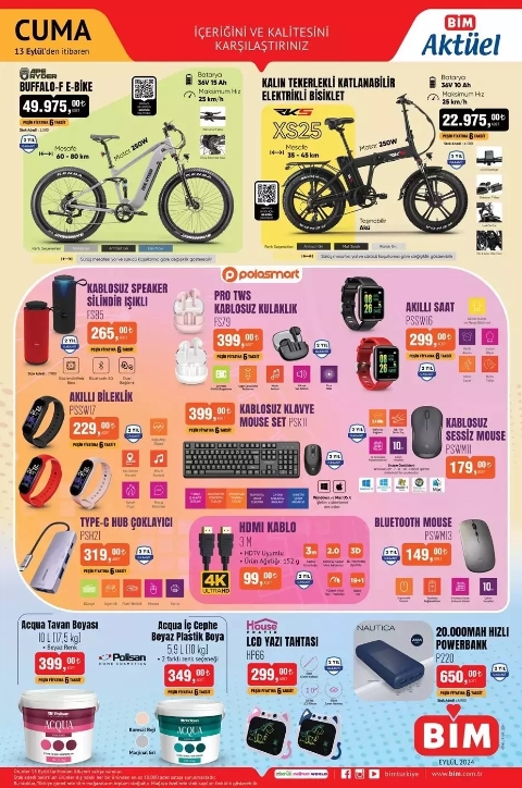 Bu Cuma BİM’e gelecek indirimli ürünler belli oldu. 13 Eylül BİM aktüel kataloğu geniş ürün yelpazesi ile dikkat çekerken fiyatlar da son derece ekonomik. BİM’e gelecek indirimli ürünler arasında akıllı saatler, elektrikli bisiklet, ankastre set, TV, airfryer gibi ürünler öne çıkıyor. İşte yeni BİM aktüel indirimleri listesi… Katoloğun Devamını okumak için Lütfen sonraki sayfaya geçiniz..