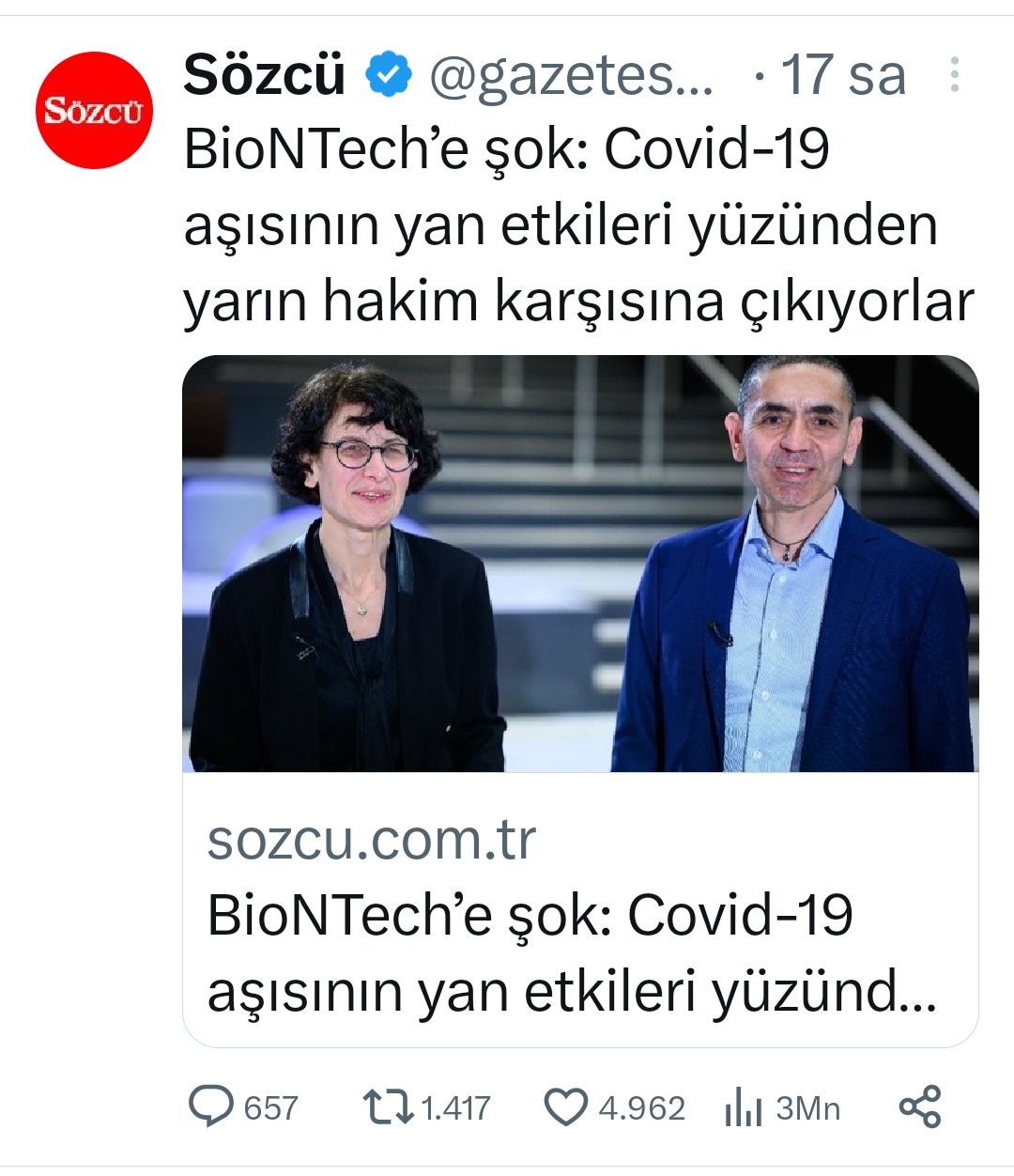Türk bilim insanları Uğur Şahin ve Özlem Türeci'nin kurduğu ve mRNA bazlı Covid19 aşısı sayesinde bütün dünyanın tanıdığı şirket BioNTech, yarın yargı karşısına çıkıyor...