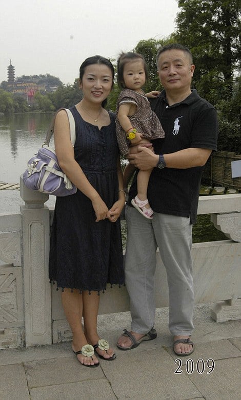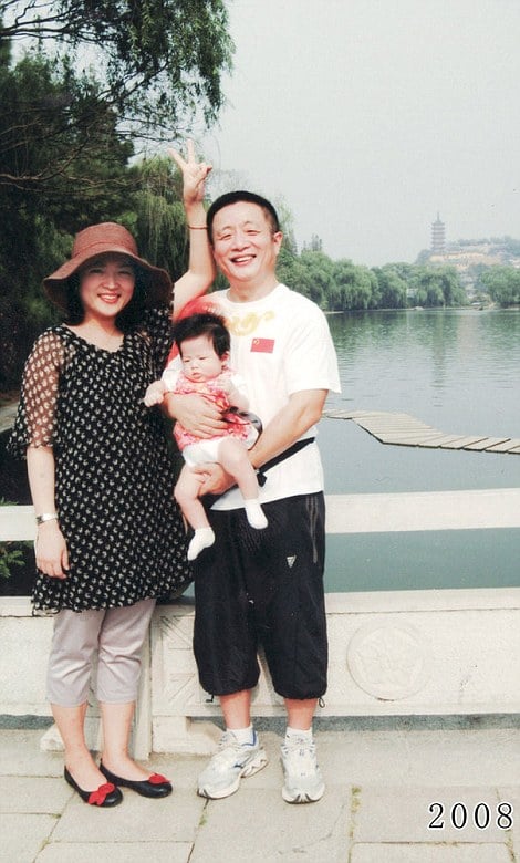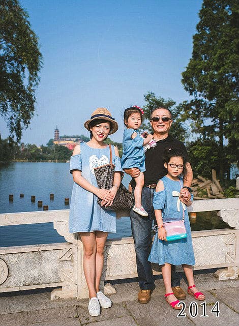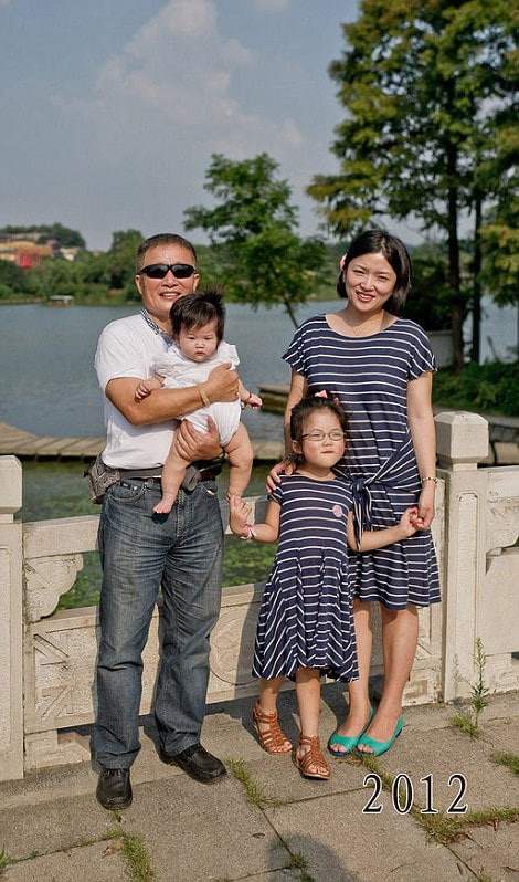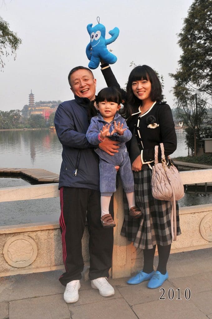 1980 Bu 1980'de çekilmiş siyah beyaz fotoğraf ilk seriden. Hua, gurulu bir baba gibi dik duruyor ve hafifçe gülümseyen bir yaşındaki k-ızı, Huahua'nın elinden tutuyor.