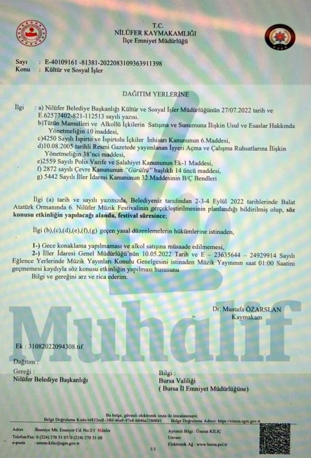 Bursamuhalif'in haberine göre, Nilüfer Kaymakamı Mustafa Özarslan'ın imzasıyla, belediyeye gönderilen resmi yazıda festivale alkol satışı ve gece konaklaması yapılamayacağı vurgulandı. Yazıda müzik yasağının da 01.00'de başladığı hatırlatıldı.