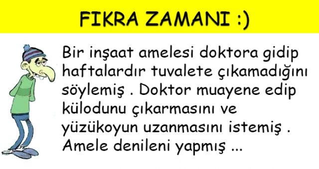 ve hadi bakalım şimdi tuvalete git olacak mı demiş . Amele gitmiş ve rahatlamış bir şekilde geri dönmüş . Doktora sormuş hep böyle rahat yapabilmek için ne yapmalıyım sürekli buraya gelemem demiş . Doktor özel bişey yapmanıza gerek yok yeter ki tuvaletinizi yaptıktan sonra poponuzu çimento kağıdıyla silmeyin yeter demiş ….