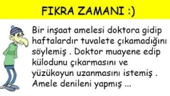 ve hadi bakalım şimdi tuvalete git olacak mı demiş . Amele gitmiş ve rahatlamış bir şekilde geri dönmüş . Doktora sormuş hep böyle rahat yapabilmek için ne yapmalıyım sürekli buraya gelemem demiş . Doktor özel bişey yapmanıza gerek yok yeter ki tuvaletinizi yaptıktan sonra poponuzu çimento kağıdıyla silmeyin yeter demiş …