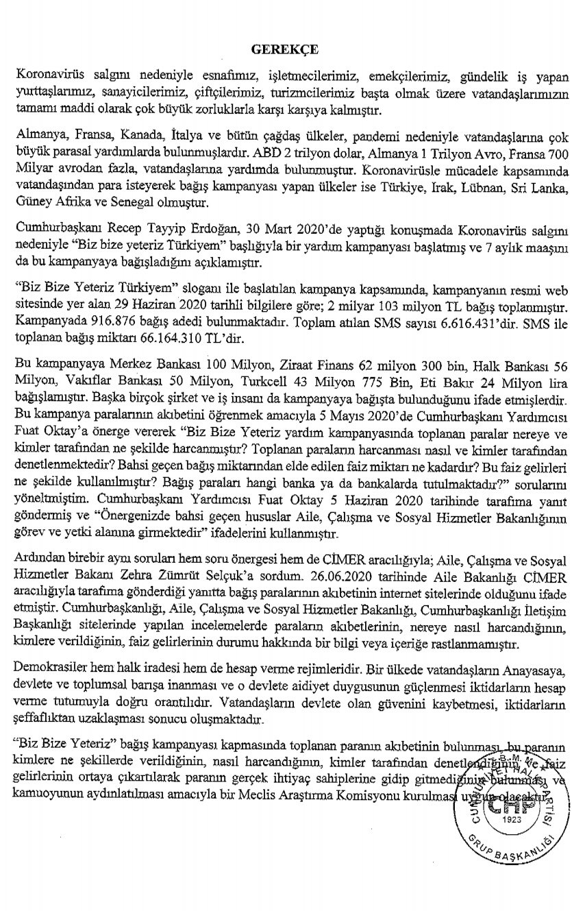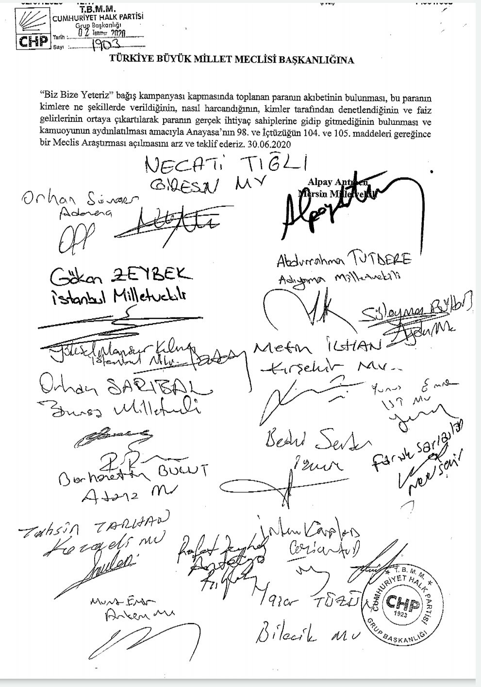 Covid19 salgını dolayısıyla 30 Mart’ta Cumhurbaşkanı Tayyip Erdoğan’ın canlı yayında IBAN vererek başlattığı "Biz Bize Yeteriz Türkiye’m" kampanyasıyla; Cumhurbaşkanlığı İletişim Başkanlığı verilerine göre, 2 milyar 105 milyon lira toplandı. Toplanan paraların nereye harcandığına ilişkin yurttaşlarda soru işaretleri oluştuğunu belirten CHP Ankara Milletvekili Murat Emir, CHP’li milletvekilleriyle birlikte Meclis Araştırma Komisyonu kurulması için araştırma önergesi verdi.