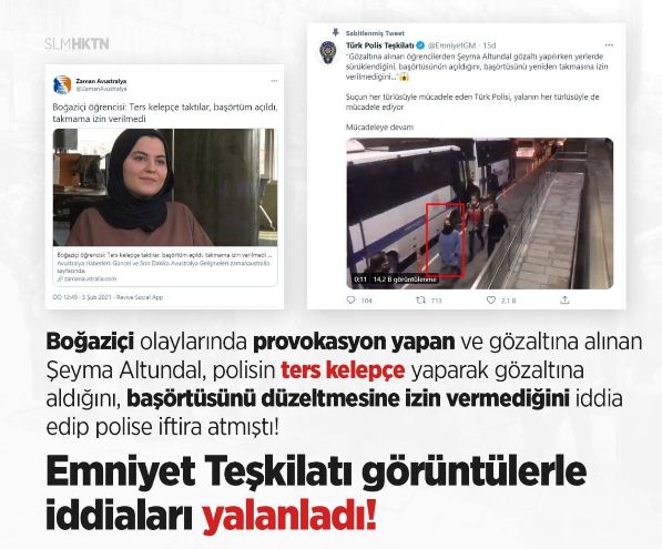 Emniyet Genel Müdürlüğünün sosyal medya hesaplarından paylaşılan videoda, başörtülü öğrenci Şeyma Altundal'ın, eylem sırasında cep telefonuyla ilgilendiği ve gözaltına alındıktan sonra kadın polis eşliğinde emniyete sevk edildiği görüldü.