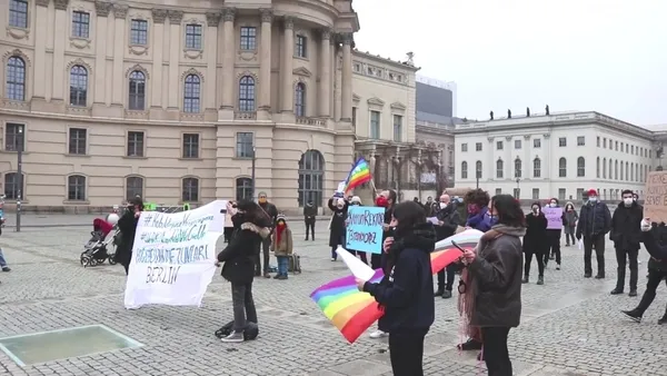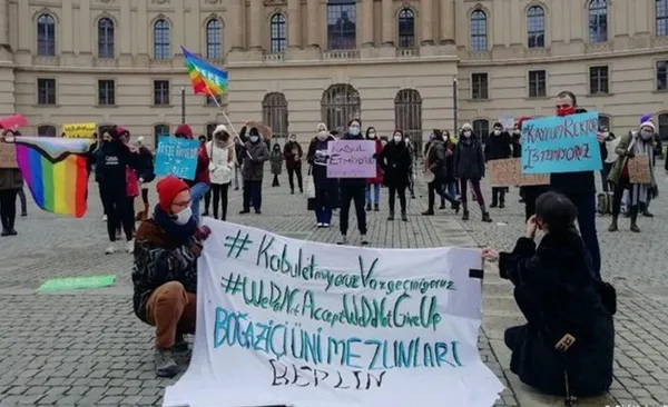 Ülkenin köklü üniversitelerinden Humboldt Üniversitesi'nin önündeki Bebel Meydanı'nda LGBT üyeleri Boğaziçi Üniversitesi'ne kayyum atamasını protesto etti.