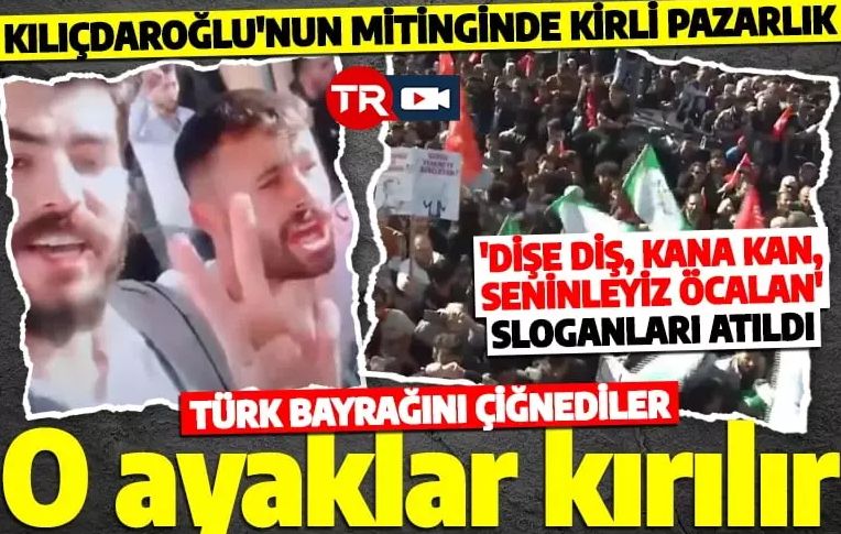 Kılıçdaroğlu'nun Van mitingindeki bir diğer skandal ise teröristbaşı Öcalan lehine atılan slogandı. Miting alanına yürüyen bir grubun "Dişe diş kana kan seninleyiz Öcalan" sloganı attığı ortaya çıktı.7'li koalisyonun Cumhurbaşkanı adayı Kemal Kılıçdaroğlu'nun Van mitingi skandal görüntülere sahne oldu. Terör örgütü PKK'nın siyasi uzantısı HDP'nin desteğini almasına rağmen her fırsatta bunu reddeden Kılıçdaroğlu'nu mitingdeki görüntüler yalanladı.