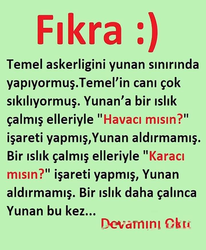 Temel askerligini yunan sınırında yapıyormuş. Temel’in canı çok sıkılıyormuş. Yunan’a bir ıslık çalmış elleriyle “Havacı mısın?” işareti yapmış,Yunan aldırmamış. Bir ıslık çalmış elleriyle “Karacı mısın?” işareti yapmış, Yunan aldırmamış… DEVAMINI OKUMAK İÇİN GÖRSELE DO/KUNUNUZ…..Ayrıntılar Haberin Detayındadır…