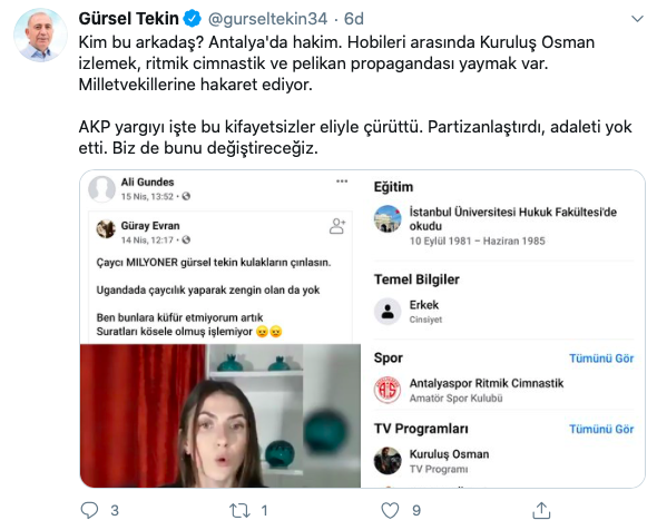 Kişisel sosyal medya adresinden tepkisini ortaya koyan Gürsel Tekin, "Kim bu arkadaş? Antalya'da hakim. Hobileri arasında Kuruluş Osman izlemek, ritmik cimnastik ve pelikan propagandası yaymak var. Milletvekillerine hakaret ediyor. AKP yargıyı işte bu kifayetsizler eliyle çürüttü. Partizanlaştırdı, adaleti yok etti. Biz de bunu değiştireceğiz" ifadelerini kullandı.