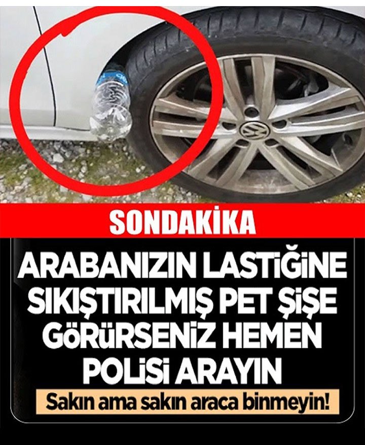 Araba lastiğine sıkıştırılmış halde duran bir pet şişeyi’ gösteren kare esasında bambaşka bir şeyi temsil ediyor. Neyi mi? Gelin birlikte bakalım.. Arabanızın lastiğine sıkıştırılmış pet şişe görürseniz dikkat! Hemen emniyete...