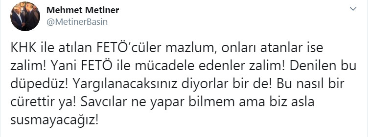 Bülent Arınç’ın FETÖ çıkışının ardından AKP eski Milletvekili Şamil Tayyar, Arınç’ın FETÖ’yü aklamaya çalıştığını ifade ederek savcıları göreve çağırmıştı.