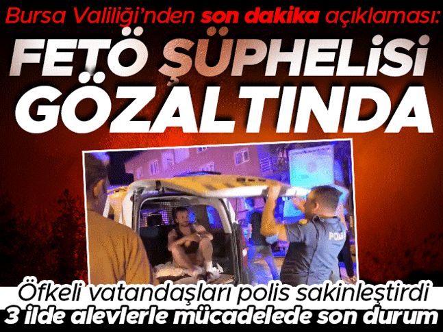 Bursa Valiliği'nden orman yangınlarına ilişkin yapılan açıklamada, "İlimizde meydana gelen orman yangınlarına ilişkin alınan ihbarlar doğrultusunda Cumhuriyet Başsavcılığı tarafından derhal soruşturma başlatılmıştır. Soruşturma çerçevesinde, geçmişte FETÖ ile bağlantısı nedeniyle hakkında işlem yapılmış bir şahıs gözaltına alınmıştır" denildi.