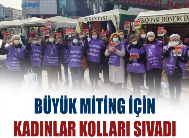 Binlerce kadın 6 Mart'ta Cumhuriyet Kadınları Derneği'nin öncülüğünde yapılacak mitinge hazırlanıyor. “Yükselen Kadın Yükselen Türkiye” sloganıyla Dünya Emekçi Kadınlar Günü vesilesi ile Ata'nın huzuruna çıkacak kadınlar mitingin duyurusu için kolları sıvadı. Cumhuriyetin kadınlarının Ankara'da mitingin duyurusu için başlattığı çalışmaya ilgi de oldukça yoğundu. Miting kapsamında kadınının üretime katılma güç ve kararlılığı vurgulanacak. İşçi, esnaf, memur, çiftçi, kooperatifçi, Diyarbakır Anneleri, sanatçılar, sporcular, ev kadınlarının katılacağı “Yükselen Kadın Yükselen Türkiye” mitingi için CKD üyeleri Ankara'nın Çankaya ilçesindeki Nişantaşı Pazarı önünde çalışma masası açtı. Hazırlanan broşürler tek tek yurttaşlara dağıtıldı. CKD Çankaya Şube Başkanı Ersin Talun ile CKD Genel Yönetim Kurulu üyesi Melek Güvenç yurttaşları büyük mitinge davet etti. Talun, “Tepkiler çok olumlu geldi. İnşallah güzel günler göreceğiz. Herkesi mitingimize davet ediyoruz. Kadınımızın büyük üretici gücünü ortaya çıkararak kutlama zamanı gelmiştir.” dedi. Güvenç de “Kadınlarımızın yükselmesi Türkiye'yi yükseltecektir.” diye konuştu.