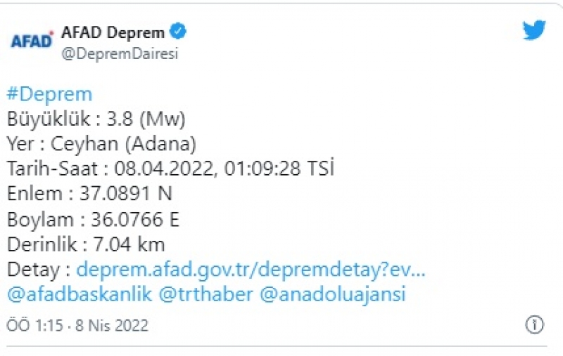 Kandilli Rasathanesi'nden yapılan açıklamaya göre depremin merkez üssü Tatarlı Ceyhan (Adana) olarak belirtilirken depremin büyüklüğü 3.8, derinliği ise 7.5 km olarak kaydedildi.