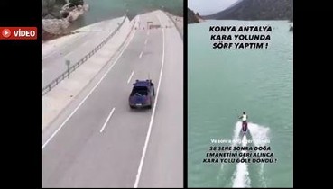 Göl yatağına yapılan otoyol sular altında kaldı: Arabasını bırakıp Konya-Antalya yolunu sörf yaparak geçti!