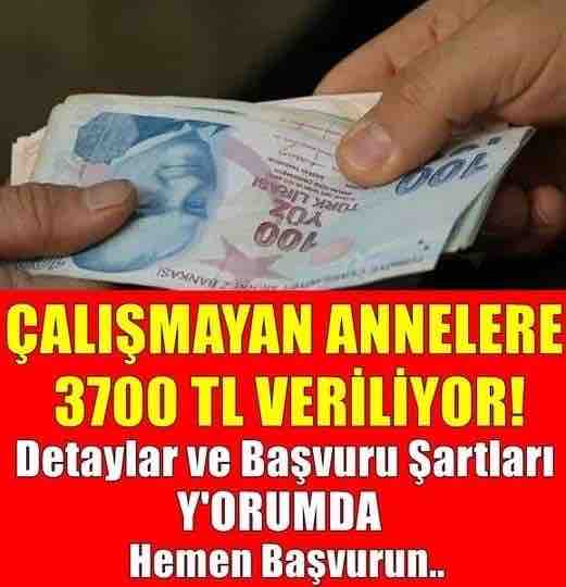 Çalışmayan annelere, Aile ve Sosyal Hizmetler Bakanlığı tarafından 3.700 TL destek ödemesi yapılacak.Aile ekonomisine destek olacak bu ödeme için başvurular ile ilgili ayrıntılar da netleşmeye başladı. 3.700 TL'lik ödemeden faydalanabilmek için annelerin başvuru şartlarını sağlaması gerekiyor.