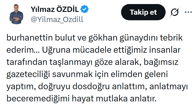 “Burhanettin Bulut ve Gökhan Günaydın’ı tebrik ederim… Uğruna mücadele ettiğimiz insanlar tarafından taşlanmayı göze alarak, bağımsız gazeteciliği savunmak için elimden geleni yaptım, doğruyu dosdoğru anlattım, anlatmayı beceremediğimi hayat mutlaka anlatır.”