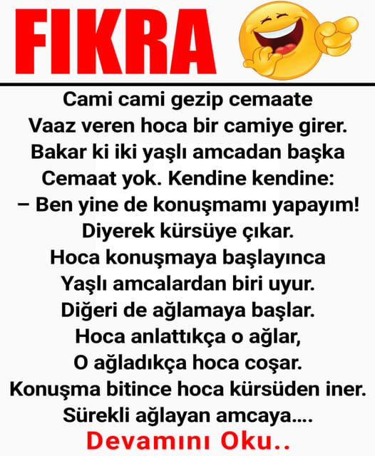Cami cami gezip cemaate vaaz veren hoca bir camiye girer. Bakar ki iki yaşlı amcadan başka cemaat yok. Kendine kendine: – Ben yine de konuşmamı yapayım! Diyerek kürsüye çıkar. Hoca konuşmaya başlayınca yaşlı amcalardan biri uyur.