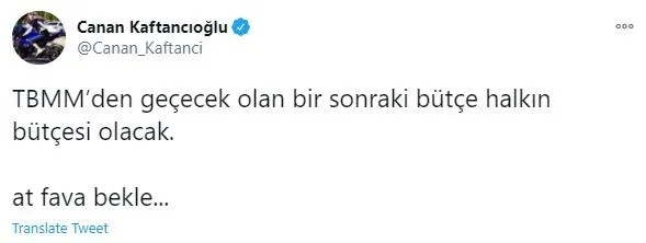 2021 Yılı Merkezi Yönetim Bütçe Kanun Teklifi ile 2019 Yılı Merkezi Yönetim Kesin Hesap Kanunu Teklifi, TBMM Genel Kurulu'nda kabul edildi. Konuya ilişkin Twitter hesabından bir paylaşımda bulunan CHP İstanbul İl Başkanı Canan Kaftancıoğlu, "TBMM'den geçecek olan bir sonraki bütçe halkın bütçesi olacak. at fava bekle..." ifadelerini kullandı.