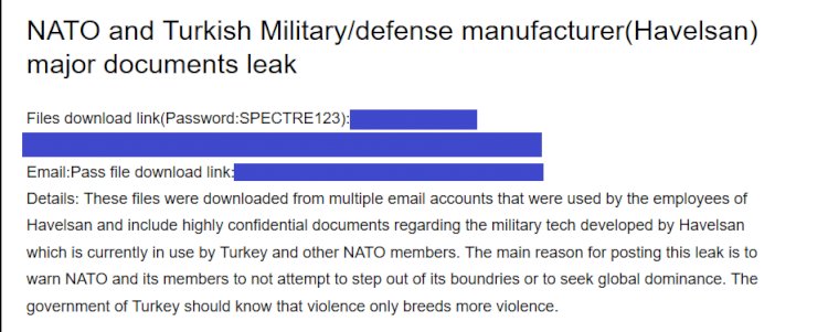 ABD merkezli cybleinc.com adlı siber güvenlik üzerine haber yapan sitede, Spectre123 isimli bir kullanıcı tarafından NATO’ya ve Türkiye’den Havelsan’a ait gönderilerin paylaşıldığını duyurdu. Paylaşımların hassas bilgiler içerdiği belirtilirken, olayın siber saldırı mı yoksa içeriden bir sızdırma mı olduğu ise henüz belli değil. Veryansın Tv’nin ulaştığı uzmanlara göre bu bilgi doğruysa bu Türkiye için kabul edilemez bir şey ve skandal.