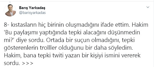 Hakim karşısına çıktım. Tüm bunları anlattım. Trollerin hedef göstermesi yüzünden gözaltına alındığımı, bir suç işlemediğimi, sevk maddesi olan TCK 216'daki kıstasların hiç birinin oluşmadığını ifade ettim. Hakim 'Bu paylaşımı yaptığında tepki alacağını düşünmedin mi?' diye sordu. Ortada bir suçun olmadığını, tepki gösterenlerin trolller olduğunu bir daha söyledim. Hakim, bana tepki twiti yazan bir kişiyi ismini vererek sordu. Tanıyıp tanımadığımı, trol olup olmadığını sordu. Tanımadığımı söyledim. Avukatım Süleyman da gerekli savunmayı yaptı. Hakim 10 dakika ara verdi. Ardından ise "Toplumda oluşan tepki"yi gerekçe göstererek tutuklanmama karar verdi. Ailemle görüşmeme izin de verdi. Hukuksuz bir karar bu."
